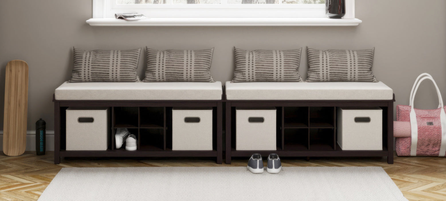 Entryway benches include collapsible cream tweed 11in. x 11in. fabric bins ideal for storing gloves, hats and more.
