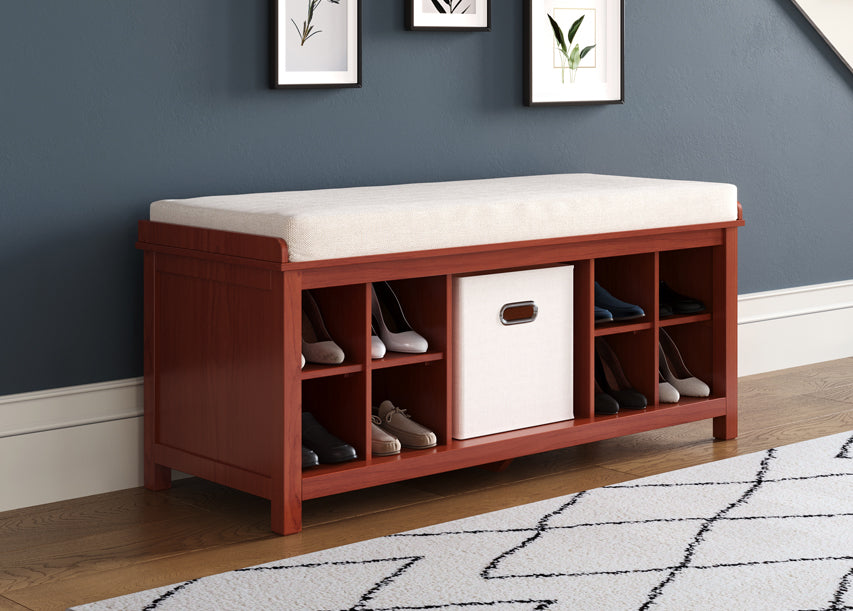 This piece offers impressive storage versatility. The built-in cubbies are perfect for neatly organizing shoes, bags, or seasonal accessories, helping you conquer clutter once and for all. Made from real wood, this bench is built to endure, ensuring that its beauty and functionality will be a part of your home for years to come.